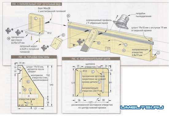 6. Тем же самым пазовым диском выпилите шпунт в пробном обрезке доски и проверьте, как входит в него ползун углового упора. Он должен свободно перемешаться вдоль шпунта с минимальным люфтом. Скорректируйте настройки, если требуется. Положите крышку пластиком вниз и выпилите в ней паз для углового упора . Чтобы не было сколов на выходе пильного диска, используйте подпорный брусок.