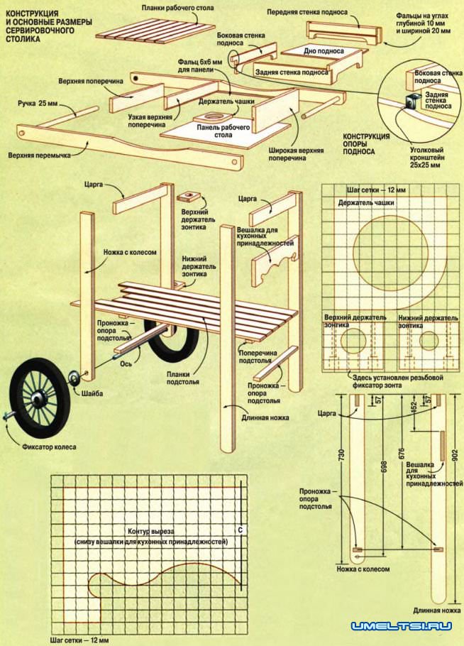В средней части сбоку сервировочного столика располагается съёмный поднос, дно которого можно сделать из 6-мм фанеры, облицованной пластиком. Поднос подвешивается на уголковых кронштейнах. Пазы и фальцы в деталях подноса и сервировочного столика для установки соответственно дна и панели выбирают до сборки.
