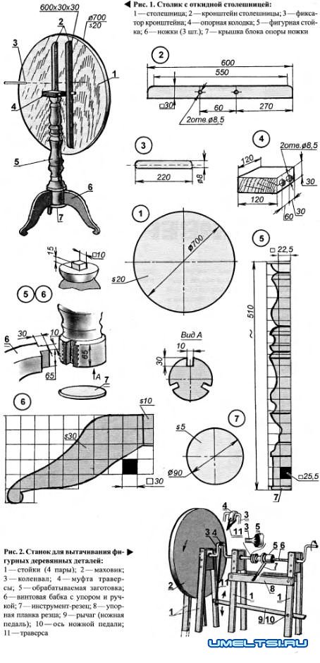 Как видим, устройство столика простое и особых трудностей для изготовления не представляет. Единственная деталь, которая может озадачить заинтересовавшегося этой конструкцией, — это точёная стойка: как её получить, какими приспособлениями пользоваться? Конечно, самый простой путь — пойти в магазин строительных деталей и приобрести готовую балясину, используемую для боковых ограждений деревянных ступенчатых лестниц, популярных в домах с мансардой. Или попробовать получить фигурную стойку, проделывая её ложбинки и выпуклости с помощью долот и грубых круглых напильников. Однако вряд ли доставит удовлетворение полученный результат: уж очень трудоёмок путь к нему.
