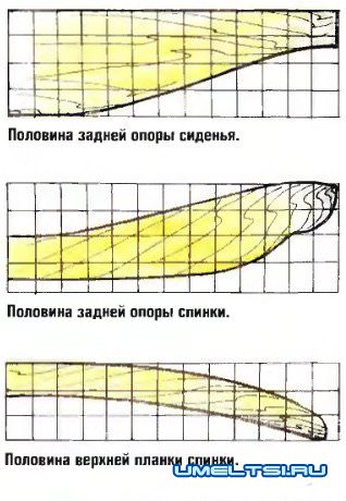 6. Предварительно (до окончательного крепления) подбирают все планки спинки сиденья, устанавливают одинаковый зазор между ними. При этом нужно совместить середину центральной планки спинки с серединой задней опоры спинки и задней опоры сиденья. Затем карандашом наносят контур фигурной линии спинки. Он может быть произвольным, главное — симметричным. Далее — каждый конец планки надрезают лобзиком. Ребра планок скругляют. Когда все планки будут установлены, верхние торцы планок шлифуют по фигурному контуру.