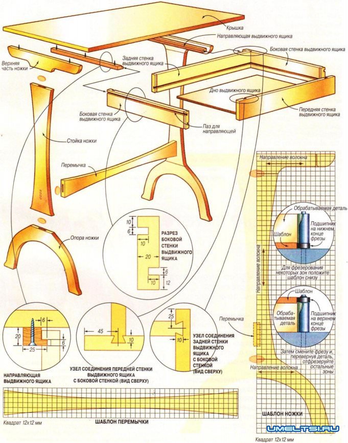 Все три части ножек стола обрабатывают на фрезерном станке по изготовленному шаблону цилиндрической фрезой. Начинают с изготовления шаблона для всей ножки в масштабе 1:1 из 6-мм фанеры или ДВП. Начертив контур ножек, выпилите его и зачистите кромки.