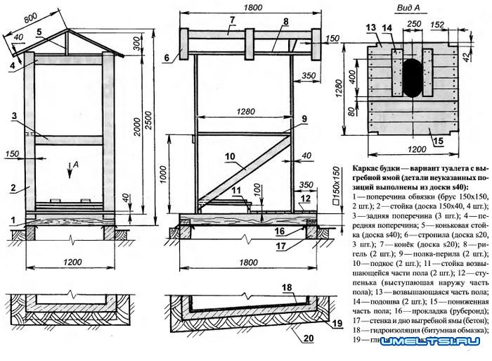 При выборе места необходимо соблюсти некоторые санитарные требования. Если на участке есть колодец, то туалет необходимо расположить не ближе, чем в 20 м от него, а также на расстоянии не менее пяти метров от жилого дома. При наличии выгребной ямы надо оставить и проезд к туалету для специального автотранспорта. Вариант туалета с выгребной ямой изображён на чертеже каркаса будки.