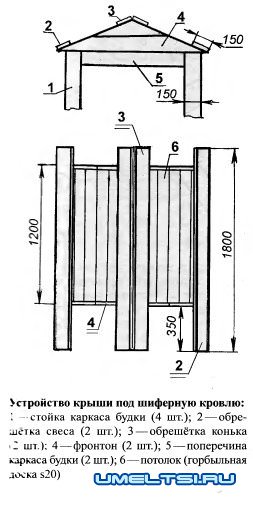 Крыша будки двухскатная, что придаёт туалету вид домика. В качестве кровли использован оцинкованный стальной лист. Как вариант, привожу и чертёж устройства обрешётки крыши под шиферную кровлю. Отличия её в том, что роль стропил в этом случае выполняют фронтоны, а обрешёткой служат прогоны — коньковые и нижние. Поскольку крыша металлическая и в зной сильно нагревается, в качестве теплоизолирующего слоя я в будке сделал потолок из горбыльных досок разной толщины, лишь выравняв их кромки.