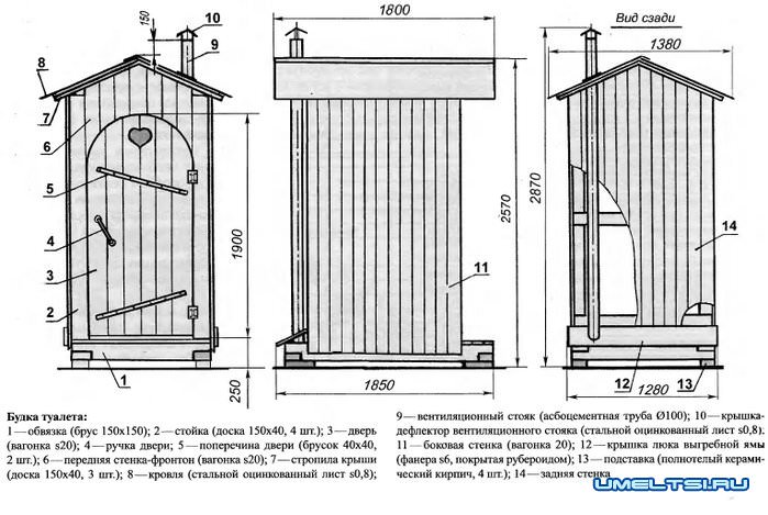 Любой индивидуальный застройщик, начиная освоение участка или возведение дома на нём, просто вынужден сначала построить хотя бы небольшой и простой туалет. Хотя отмечу, что большой капитальностью эта постройка не отличается даже на участках с особняками. Но и для современных биотуалетов лёгкая будочка с ровным полом необходима (именно такая, установленная на кирпичи, и изображена на чертеже общего вида).