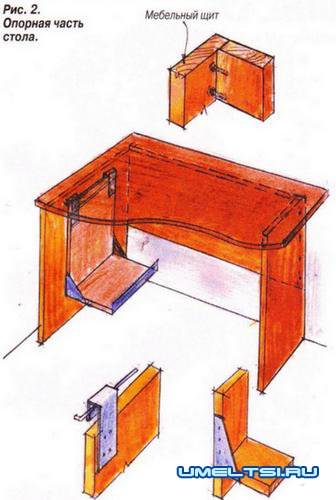 Конструктивной опорой верхней части стола служат два мебельных щита (их вполне можно заменить многослойной фанерой толщиной 15-20 мм), соединённых друг с другом при помощи металлических уголков.