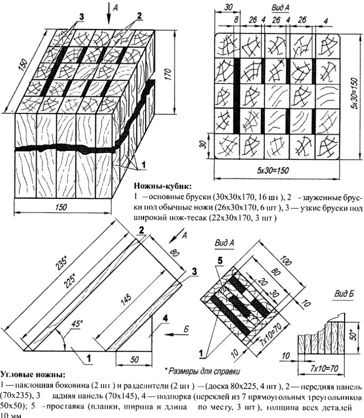 Такие ножны рассчитаны на шесть обычных лезвий плюс один широкий нож Изготовление подобной обоймы не трудоемко, так как кубик просто составляется из деревянных брусков практически одного размера Лишь некоторые из них выполняются чуть тоньше — для образования щелей под лезвия Для этого достаточно просто воспользоваться рубанком Таких брусковщелеобразователей потребуется всего девять из общего количества (25 шт) Причем три из них — тоньше основных на 8 мм, а шесть других — на 4 мм
