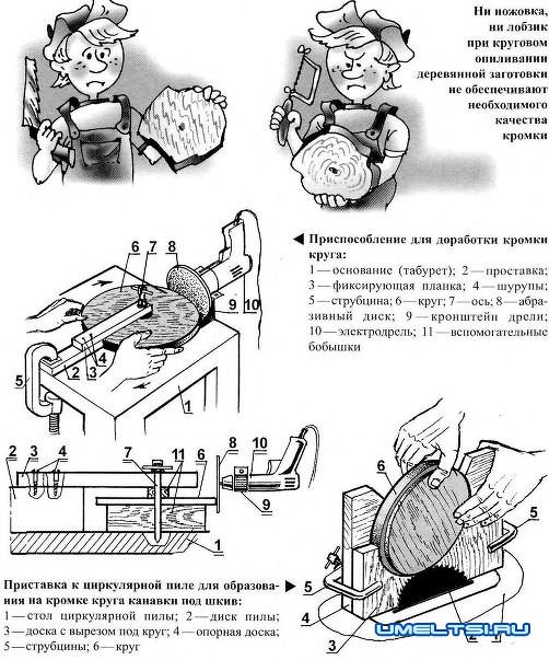 Собранный блок устанавливается на стол циркулярной пилы так, чтобы последняя доставала до кромки круга — тогда при его постепенном поворачивании на кромке будет пропиливаться канавка под шкив.