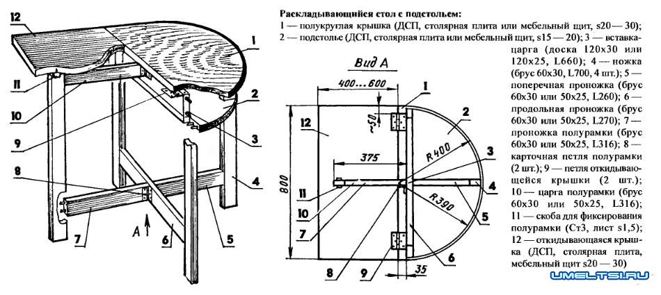 Длина передней (поперечной) про-ножки — 265 мм, задней проножки и царги полурамки — 315 мм. Эта разница в длине образовалась потому, что задние ножки вместе со связующими деталями сдвинуты внутрь (вперед) стола: чтобы сзади под полукруглой крышкой умещалась приложенная к ним полурамка и не мешала опускать прямоугольную столешницу. С этой же целью от подстолья отрезана 35-мм полоска.