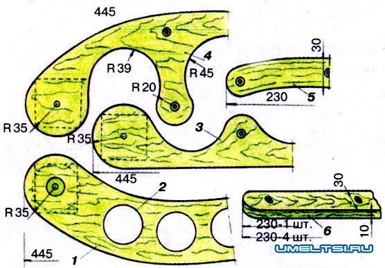1-4 — фрагменты фигурных деталей укладки для фужеров и ограждающих планок верхней столешницы.