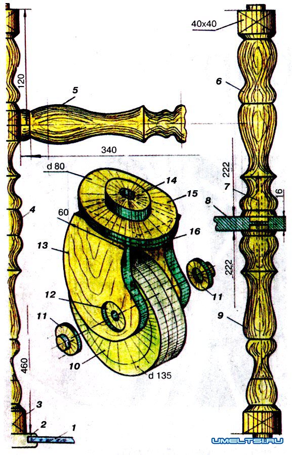 Готовое изделие лакируем, закрываем декоративными шарами выступающие концы крепежа (у рукоятки и верхних концов), а заглушками — технологические отверстия на колесах и планках ограждений.