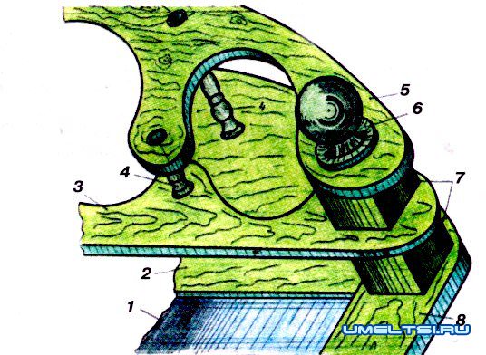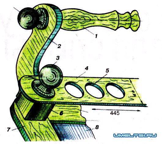 1 — рукоятка, 2 — кронштейн, 3 — шар декоративный, 4 опора кронштейна и укладки, 5 — отверстие для фужеров, 6 —опора кронштейна, 7 — столешница, 8 — стекло.