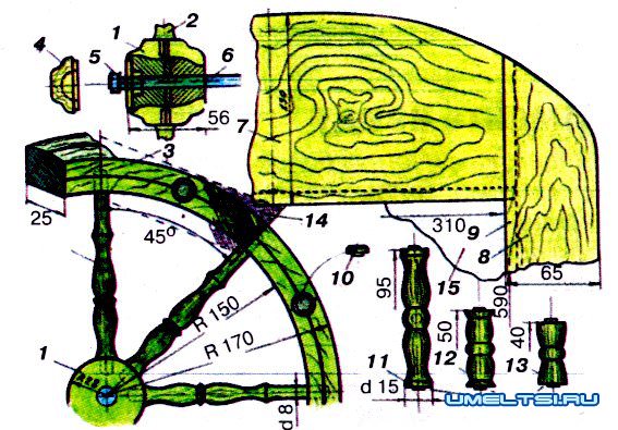 1 — ступица, 2 — спица, 3 — обод, 4 и10 — заглушки, 5 — гайка, б — ось, 7—передний торец столешницы, 8 — боковая доска, 9 — паз для стекла, 11-13 — стоечки, 14 — сегмент для склейки обода, 15 — стекло.