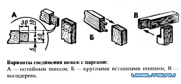 У накладных ножек сверху, со стороны, обращенной к рамке, выпиливается уступ, равный высоте рамки. К рамке ножки крепятся клеем и шурупами. В варианте ножек из ДСП, учитывая относительную хрупкость материала, на них до сборки могут быть наклеены в качестве усиления полоски фанеры, повторяющие конфигурацию ножек.