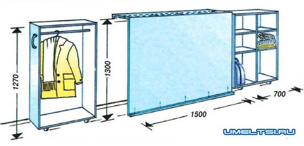 На рисунке видно, насколько прост гардероб по своей конструкции (здесь указаны ориентировочные размеры, которые могут быть изменены в зависимости от конкретных условий). Одежда и бельё хранятся в двух отдельных выдвижных (на мебельных роликах) секциях. Одна из них оборудована полками, вторая — штангой для плечиков. На передних стенках секций (они же — боковые стенки гардероба) имеются ручки.