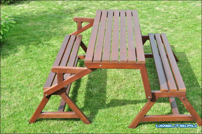 В сложенном состоянии конструкция занимает совсем мало места (фото 1). И одним движением руки обычная скамья превращается в стол с двумя лавками — отлично подходит для приема пищи на открытом воздухе или для настольных игр с детьми. На фото показано как скамейка трансформируется в стол и лавку (фото 2-4).