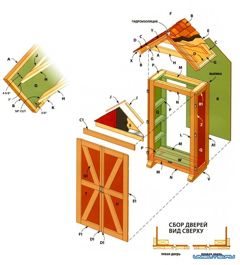 • 4 листа фанеры (самый «декоративный» лист — для внешней отделки) • сосновый брус или готовые пиломатериалы • кедровый брус (при желании можно заменить на сосновый) • 1 упаковка кедровой дранки • шурупы для наружных работ • никелированные отделочные гвозди • узкие круглые скобы (для кедровой дранки) • 1 рулон рубероида • 1 рулон алюминиевой гидроизоляции • 3 пары петель из нержавеющей стали • 1 магнит на дверь • 1 пара ручек