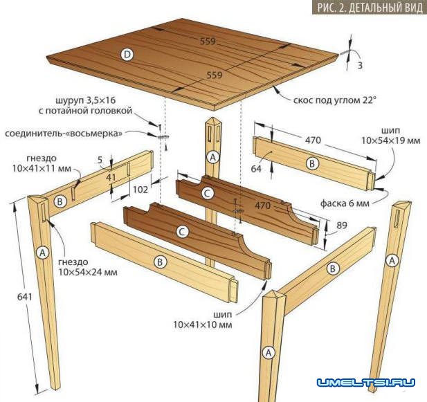 1. C помощью небольшого рубанка или шлифовальной колодки сделайте фаску на внутреннем углу шипов каждой царги В для создания зазора (рис. 1а). Насухо (без клея) соберите ножки А и царги, чтобы убедиться в плотном прилегании плечиков к ножкам.