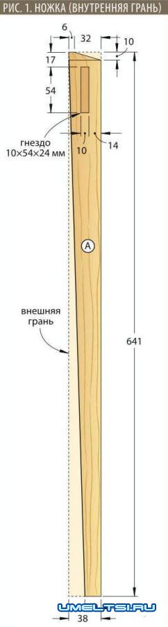 1. Из ясеневых досок толщиной 50 мм (или заготовок, склеенных из более тонких досок) выпилите ножки А (см. «Список материалов» в конце статьи). Внимательно осмотрите ножки, чтобы выбрать две смежные грани с привлекательным рисунком, которые будут расположены с внешней стороны, пометьте их, а затем разметьте на двух внутренних гранях гнезда 10x54 мм (рис. 1).