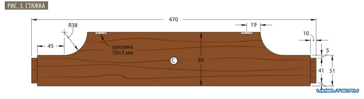 4. Сделайте копию шаблона стяжки С, чтобы разметить вырезы (рис. 3). Выпилите вырезы ленточной пилой и отшлифуйте кромки. Подрежьте верхнее плечико каждого шипа, чтобы подогнать его к гнездам царг.