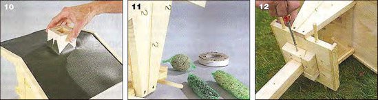 9. Крышу из фанеры размечают таким образом, чтобы при вкручивании, шурупы попали в торец боковых стенок. Предварительно промазав клеем, прикручиваем крышу кормушки.
