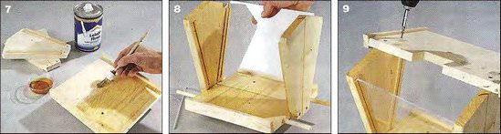 8. Боковые стенки наклейте торцам днища и закрепите шурупами. Вставляем в пазы прозрачные стенки из оргстекла.