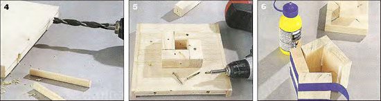 5. Прикручиваем 4 обрезанных бруска ко дну кормушки, это необходимо для соединения с опорой.