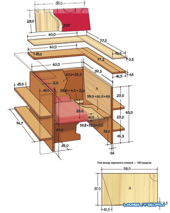 8. На боковых стенках отметьте угол в 100° между сиденьем и спинкой.