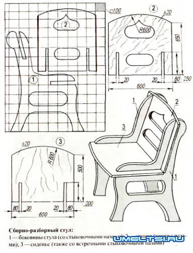 Рассмотрим подробнее устройство стула. В нём четыре основные детали: две боковины, выполненные заодно с ножками; спинка и сиденье Все они представляют собой прорезные плоскости, полученные из одного материала: фанеры или ДСП толщиной 20 мм.