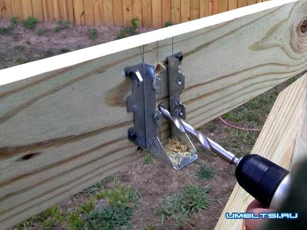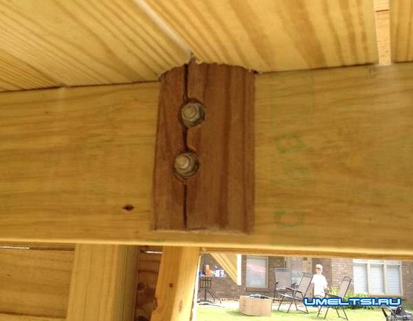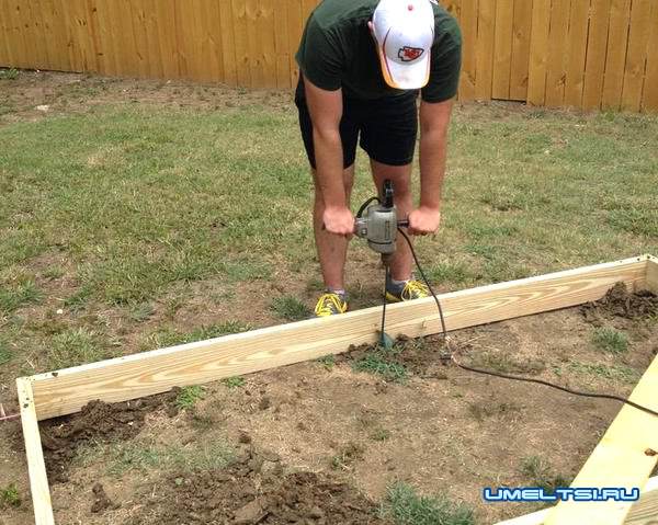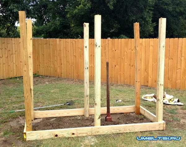 2. Соберите самый нижний уровень рамки площадки (на земле), потом по углам застопорите квадратными брусьями по углам. Готовые части каркаса скрепите винтами.