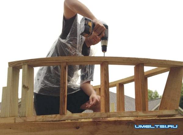 7. Далее сооружаем трап с поручнями, чтобы детишки легко могли взбираться на палубу корабля. К поручням дополнительно можно привязать тонкий канат.