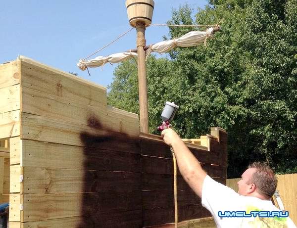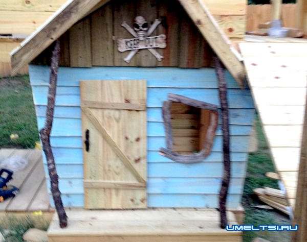 6. Используя каркасные балки в основании, соорудите игровой домик (пиратское жилище). Эффекта старины можно добиться при помощи голубой краски, разведенной водой, и крупнозернистой наждачной шкуркой, которой все затирается после высыхания краски.
