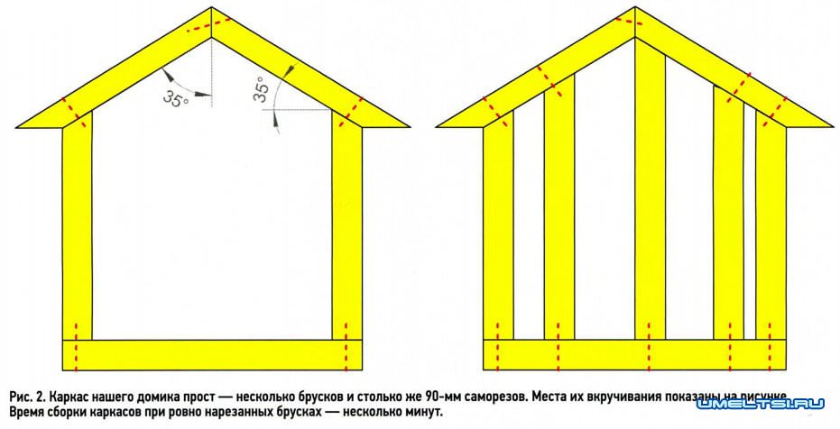 Каркас домика задумали построить из узких брусков 20 х 50 мм — так вся конструкция будет не слишком тяжелой, и прочность не пострадает.
