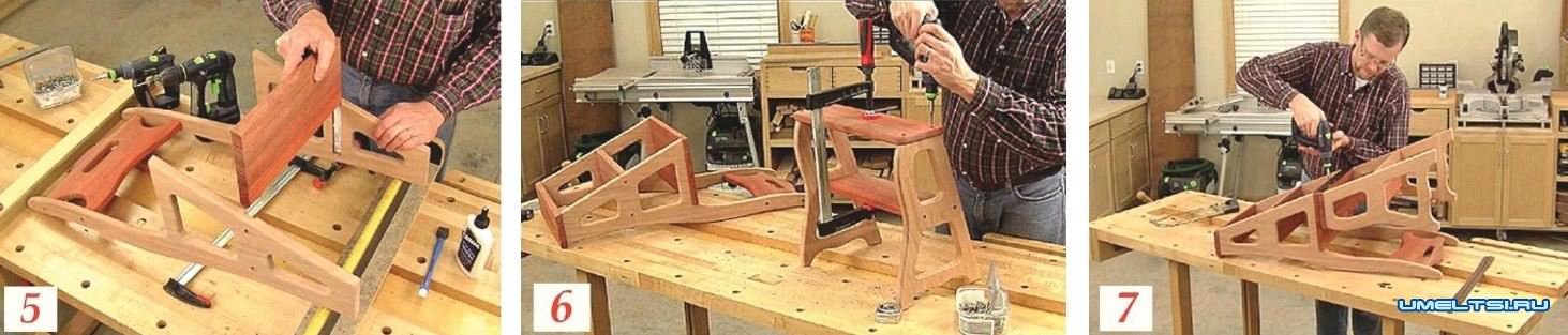 Между двух больших боковин установил спинку, зафиксировал ее струбцинами и закрепил саморезами (фото 4) В паз, предварительно смазав его строительным клеем ПВА, вставил ступеньку (фото 5) и также закрепил ее саморезами.