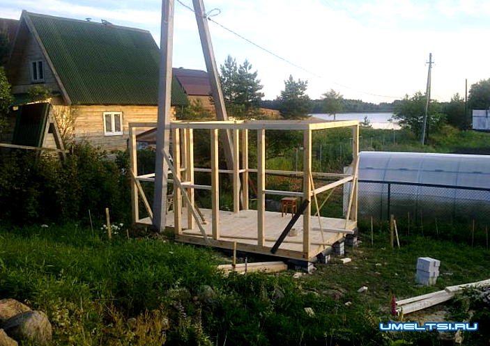 На лаги стелим пол, и ставим вертикальные брусья – это будет основа беседки.