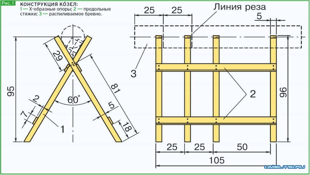 При определении высоты козел я руководствовался тем, что оптимальная высота размещения заготовки для ручной и механизированной распиловки дров варьируется в диапазоне 90-110 см. Такая высота обеспечивает комфортное положение работающего и бережёт его спину. «Рога» Х-образных опор должны надёжно удерживать бревно с максимальным диаметром 20 см. В результате высоту козел я выбрал равной 96 см. Расстояние между опорами задал в соответствии с длиной чурбака, закладываемого в печь (25 см).