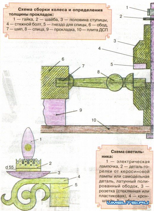 АРМАТУРА ДЛЯ УСТАНОВКИ ЛАМП. В горелках от керосиновых ламп (бывают в продаже) монтируем миниатюрные электрические патроны с лампочками-свечками, надеваем плафоны. Получается очень эффектно! Если горелок нет, их имитацию можно сделать самим (например, из латуни) и отполировать. Устанавливаем горелки на фигурных кронштейнах, выпиленных из дерева и укрепленных на ободе.