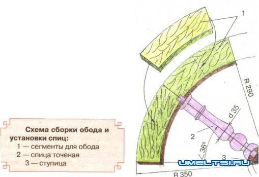 ОБОД будет наборный, из отдельных элементов. Вначале заготавливаем доски ТОЛЩИНОЙ 25мм и шириной 80-100 мм из любой породы древесины (очень хорошо смотрятся колеса из ольхи или сосны). Делаем на бумаге чертеж колеса в натуральную величину, делим окружность на 10 равных частей, вычерчиваем контуры деталей для склейки обода — понадобится 20 сегментов (по схеме сборки обода). Укладываем чертеж на кусок ДСП и склеиваем обод из готовых деталей. Применение ДСП гарантирует, что обод получится плоским и потребуется незначительная механическая обработка {в основном, шлифовка). В качестве клея рекомендую ПВА-д. Склеиваемые детали лучше сжимать струбцинами. В отшлифованном ободе высверливаем 10 глухих отверстий для установки спиц.