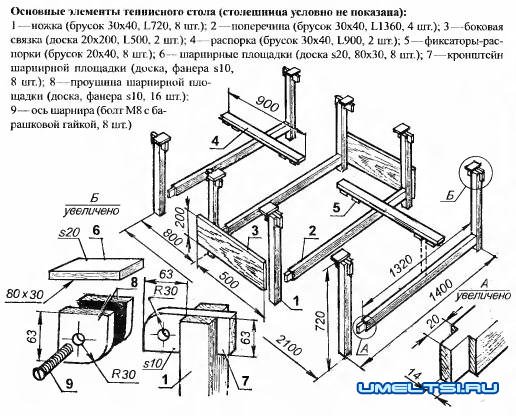 Она состоит из двух равных половин, стык которых приходится на середину центральной опоры. Каждая половина представляет собой щит из ДСП, верхняя плоскость которого имеет пластиковое покрытие. Если нет—тогда столешницу обрабатывают олифой и после просушки покрывают в несколько слоев масляной краской (зеленого, коричневого или черного цвета). По кромкам наружного периметра выполняется реечное обрамление половин игрового поля.