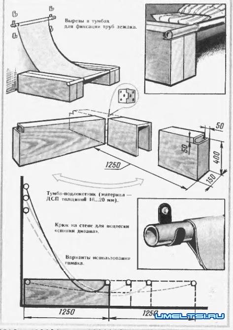 Основа лежака — плотная н прочная капроновая ткань, подшитая по краям и имеющая два сквозных кармана. В последние оставляются две дюралюминиевые трубы диаметр 50 мм. В качестве опор для труб служат три пары крюков на стене и вырезы в тумбах-подлокотниках. По желанию «спинку» дивана можно поднять или опустить, создавая удобное анатомическое сиденье.