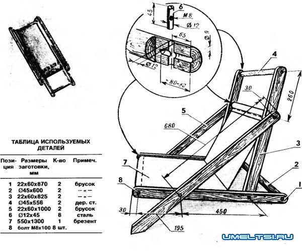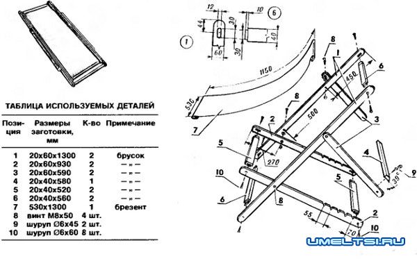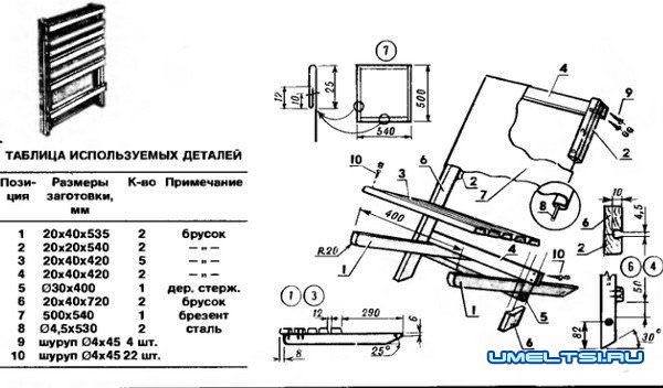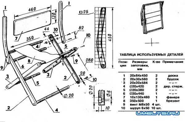 Одинаково с уважением относясь к противостоящим мнениям, администрация пытается найти оптимальный вариант подачи материалов. Примером этого может быть предлагаемая читателям подборка конструкций складных кресел для дачного участка. В качестве эксперимента мы решили полностью исключить «слова», оставив лишь чертежи, хотя и очень подробные.