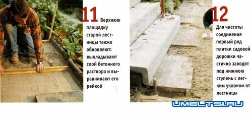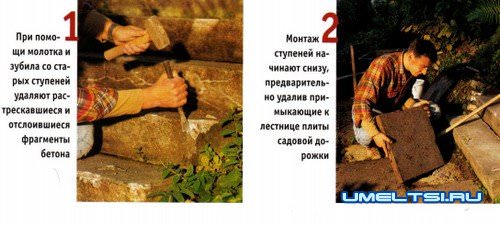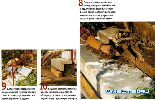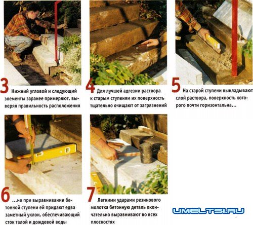 Монтаж ступеней начинают снизу, постепенно поднимаясь наверх. Для работы потребуются уровень, резиновый молоток, обычный молоток, зубило, кельма (мастерок), шпатель, щетка с жесткой щетиной. Новые ступени укладывают поверх старой лестницы на морозостойкий бетон. При этом необходимо следить, чтобы между новыми деталями и старым основанием не оставалось пустот, которые в дальнейшем могут стать прибежищем патогенных микроорганизмов (грибки, мхи, лишайники и др.)» способных разрушить поверхность бетона продуктами жизнедеятельности (органическими кислотами). Нехитрое приспособление в виде пары коротких деревянных брусков, положенных на уже смонтированную ступень, поможет не только легко перемещать по ней следующую, столь же весомую деталь, но и сберечь нижнюю ступень от внешних повреждений и ненужного сдвига.