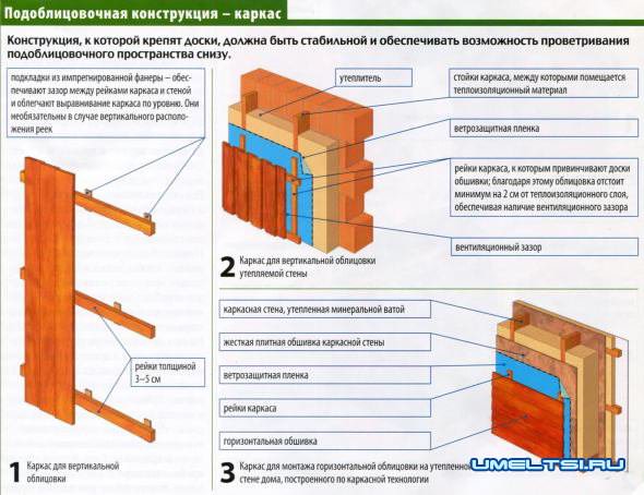 Для монтажа обшивки используют каркас - несущую подоблицовочную конструкцию, к которой крепят вагонку. Каркас состоит из импренированных (то есть пропитанных специальными составами) деревянных реек шириной 3-5 см; если здание нуждается в утеплении, стойки каркаса часто делают из более широких досок, между которыми помещают теплоизоляционный материал. В этом случае расстояние между стойками зависит от ширины теплоизоляционных плит, поскольку утелитель должен плотно заполнят пространство между элементов каркаса.