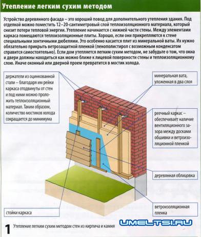Если стена не утепляется, рейки каркаса размещаются через каждые 40-60 см. Если доски обшивки будут располагаться горизонтально, то рейки, к которым они крепятся, необходимо устанавливать вертикально. Хорошие специалисты не крепят каркас к неровной стене. Сначала с помощью уровня они проверяют, достаточно ли она ровная. Всякие отклонения от вертикали и горизонтали нивелируют, подкладывая под рейки каркаса полосы импрегнированной фанеры. Нужно обязательно проконтролировать, чтобы рейки каркаса прибивались или прикручивались к стене дома только одним крепежным элементом по ширине.