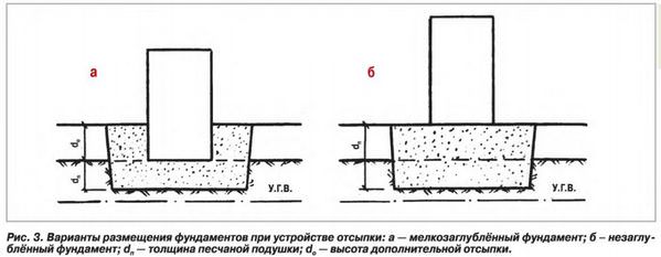 Поверхность заболоченных участков, как правило, находится или в уровне прилегающей территории, или ниже. Для отведения ливневых и паводковых вод от дома рекомендуется повысить уровень строительной площадки путём отсыпки грунта. В пределах траншей ленточных фундаментов отсыпку и обратную засыпку выполняют из непучинистого грунта — крупного или средней крупности песка, а за пределами траншей — любым грунтом (рис. 3).