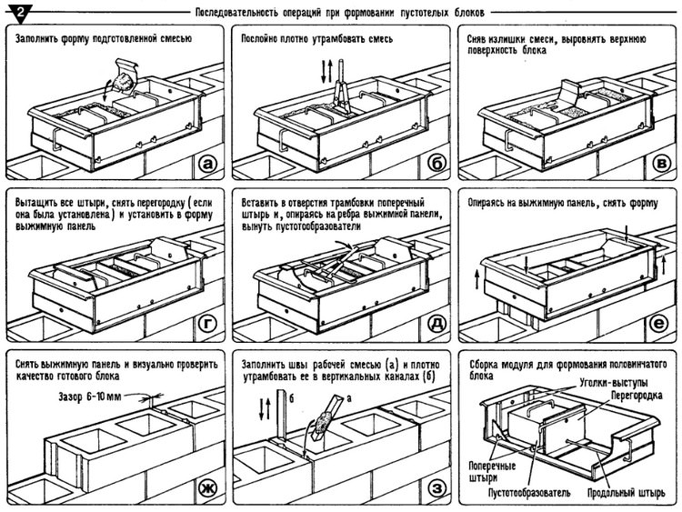 Модуль прост в эксплуатации, работа с ним не требует специальных строительных навыков. Готовят смесь перемешиванием цемента и песка с небольшим содержанием воды («жесткая» смесь). Основное требование к песку — он не должен быть мелкий или пылеватый. Песок можно использовать непросеянный. Более того, в него можно добавить и немного мелкого щебня. В смесь нельзя добавлять пористые заполнители (керамзит, шлак, опилки и т.п.), так как они существенно снижают морозостойкость стены, усложняют процесс приготовления смеси и формования блоков. Использование «жесткой» смеси позволяет уплотнять ее трамбовкой и сразу же без задержки снимать форму.
