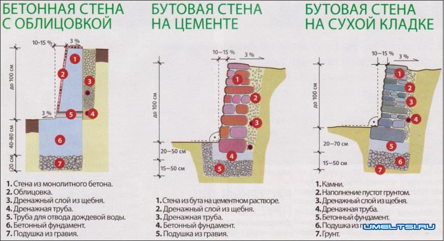 Длинную стенку рекомендуется прервать вставками архитектурных элементов — лестниц, ниш и цветников, пристенных скамеек. А вместо одной высокой стенки лучше построить каскад более низких. Конструкции высотой от 150 см или стенки, возводимые на грунте, склонном к сдвигам, требуют сооружения фундаментов. Не следует забывать, что такие перепады высот для безопасности нужно закрывать ограждениями высотой не менее 1 м.