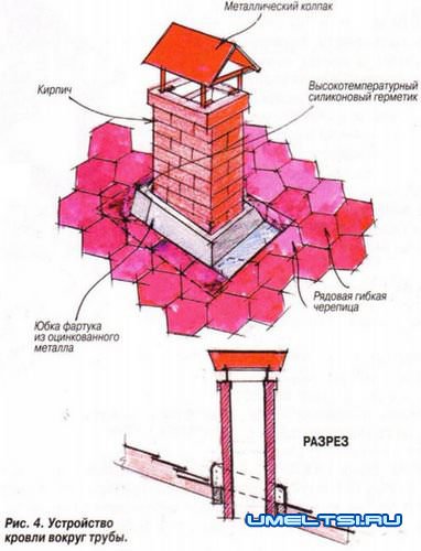 Извечную проблему защиты крыши вокруг дымовой трубы от проникновения влаги и возможного перегрева мягкой черепицы, примыкающей к ней, можно решить с помощью металлического фартука (рис. 4,5), изготовленного из прямоугольного металлического листа (его габариты зависят от сечения трубы). Выше трубы он заходит под кровлю, а ниже трубы часть фартука накрывает кровлю. Поэтому дождевые потоки, наталкиваясь на металлический бортик фартука, обходят его слева и справа от трубы. Пространство между трубой и бортиком заполняется высокотемпературным силиконовым герметиком.