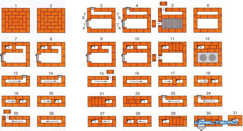 В 11-м ряду перекрываем первый колпак и свод над топочной дверкой, а в 12-м завершаем кладку перекрытия первого колпака и монтируем варочную плиту.