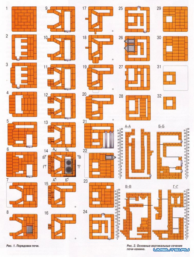 Кладка печи. На рис. 1 и 2 показаны порядовки и сечения печи-камина.