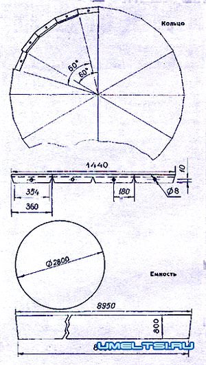 Опорное кольцо которое расположено внизу делается так само как и верхнее, одно отличие от последнего, оно скручивается болтами. Далее в узкое продольное отверстие, образованную двумя рядами уголков, вставляем приготовленную стенку из жести. Она выполнена из нескольких листов, соединенных болтами. Внутреннею часть бассейна из тентового материала, а так же из него выполнены вертикальные стенки и дно (габариты указаны на рисунке), делают так. Прежде сшивают стенку, потом к ней пришивают (пристрачивают двойным швом) дно. Швы проклеивают водостойким клеющим составом «Момент».